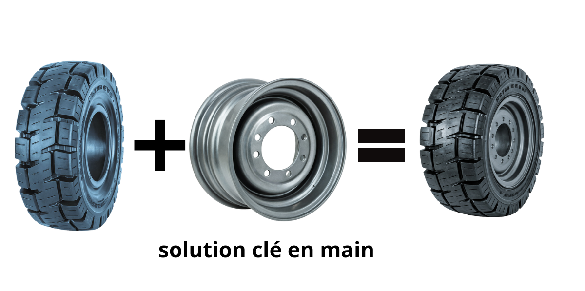 Nous fournissons des pneus pleins neufs déjà montés sur jantes rotatives, permettant un échange immédiat sur le site du client.